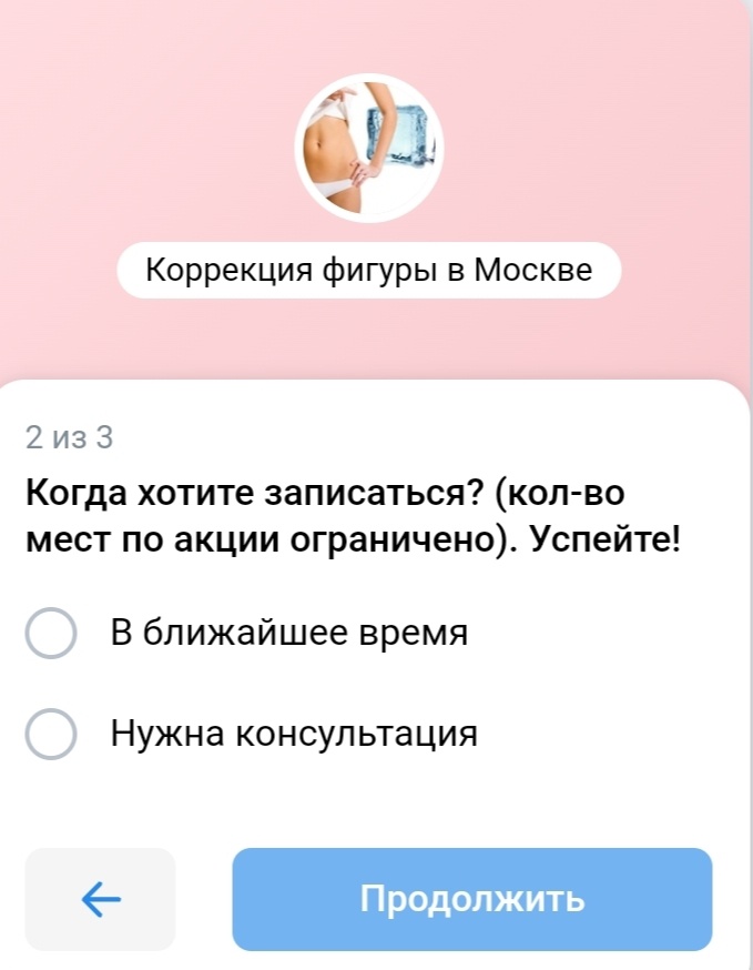 • после активации, клиентка проходила скрипт с информацией о процедурах и возможностью записаться по акции в 1 клик.